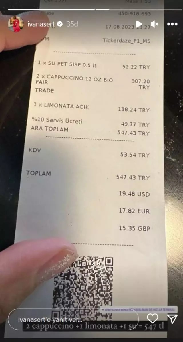 Ivana Sert havalimanı'nda içeceklere ödediği parayla şoke oldu. Genellikle kazancını gayrimenkule yapan Sert, 2 kahve, bir su ve limonataya 547 lira ödeyince şoke oldu.