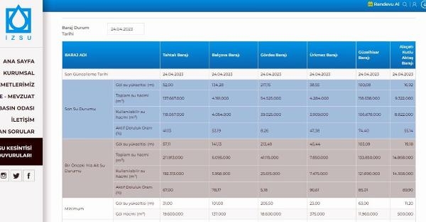 İzmir'in su ihtiyacı Tahtalı, Balçova, Ürkmez, Güzelhisar, Gördes ve Alaçatı Kutlu Aktaş barajlarından ve yer altı kaynaklarından karşılanıyor. Fakat bu yıl yeterli yağış olmadı, kuraklığın da etkisiyle barajlardaki su oranları düştü. İzmir Büyükşehir Belediyesi Su ve Kanalizasyon İdaresi (İZSU) Genel Müdürlüğü verilerine göre; kentin su ihtiyacının yüzde 44'ünün karşılandığı Tahtalı Barajı'nda geçen yıl yüzde 67 olan doluluk oranı, bu yıl yüzde 41,13'e düştü. Balçova Barajı'ndaki doluluk oranı 78,17'den yüzde 53,19'a, Ürkmez Barajı'nda yüzde 90,61'den yüzde 47,38'e, Güzelhisar Barajı'nda yüzde 85,01'den yüzde 74,40'a ve Alaçatı Kutlu Aktaş Barajı yüzde 89,90'dan yüzde 55,14'e geriledi. Sadece Gördes Barajı'nın doluluk oranı, yüzde 5,18'den yüzde 8,26'e yükseldi.