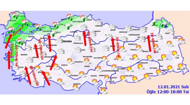 Kıyı Ege'de (Çanakkale, Balıkesir'in batı ilçeleri, İzmir) yarın(12.01.2021) beklenen sağanak ve gök gürültülü sağanak yağışların öğle saatlerinden itibaren kuvvetli (21-50 kg/metrekare) olması, beklendiğinden meydana gelebilecek sel, su baskını, yıldırım ve ulaşımda aksamalar gibi olumsuzluklara karşı dikkatli ve tedbirli olunmalıdır.