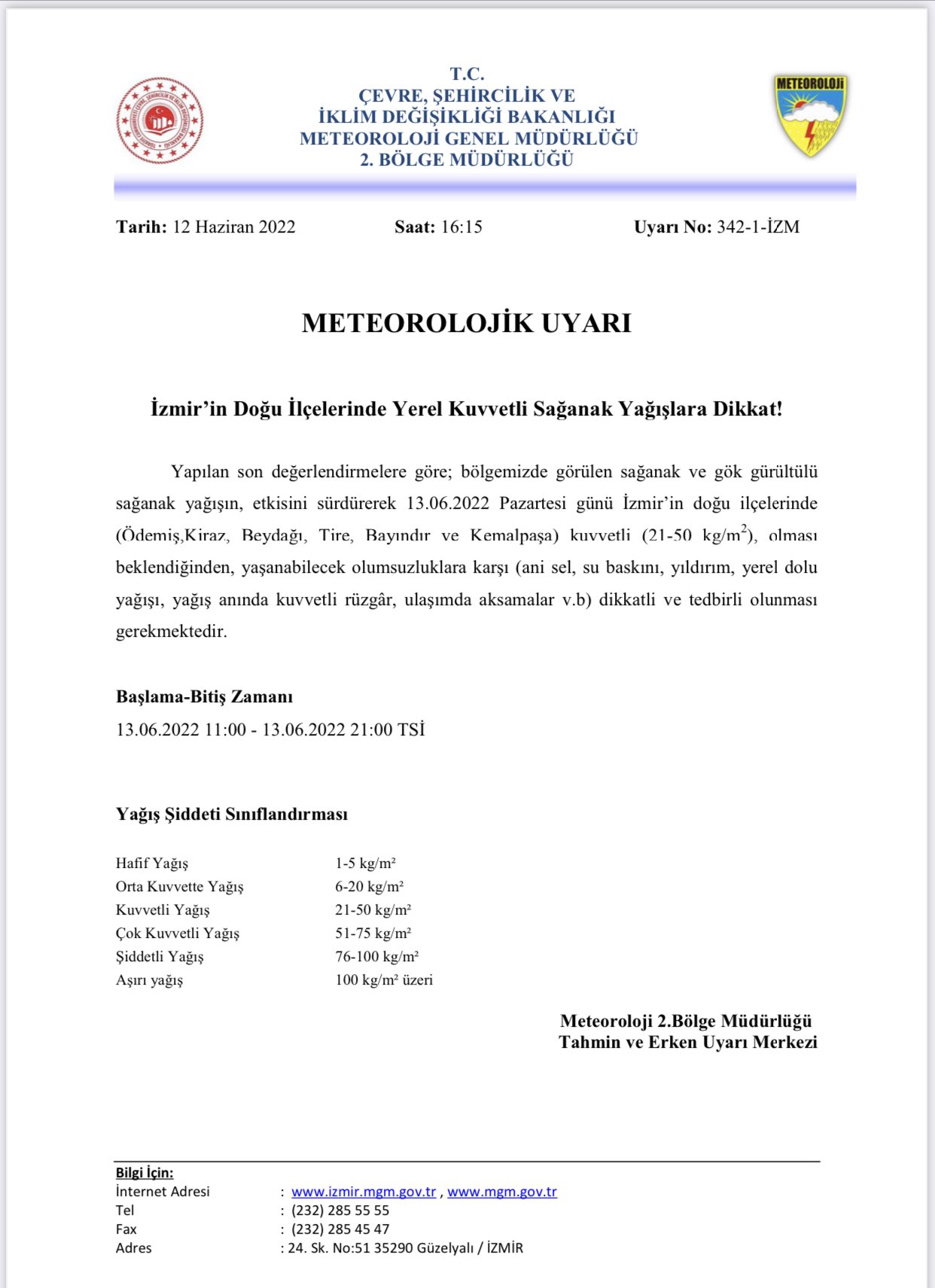 Meteoroloji 2'nci Bölge Müdürlüğü, yarın İzmir genelinde etkisini sürdürmesi beklenen sağanak ve gök gürültülü sağanak yağışın, İzmir'in doğu ilçeleri Ödemiş,Kiraz, Beydağı, Tire, Bayındır ve Kemalpaşa'da kuvvetli gök gürültülü sağanak yağış (21-50 kg/m2) olarak beklendiğini bildirdi. Kuvvetli gök gürültülü sağanak yağışın yarın 11.00'de başlayıp, 21.00'de sona ermesinin beklendiği belirtildi. Vatandaşlardan, ani sel, su baskını, yıldırım, yerel dolu yağışı, yağış anında kuvvetli rüzgar, hortum ve ulaşımda aksamalar gibi olası olumsuzluklara karşı dikkatli ve tedbirli olunmaları istendi. (DHA)