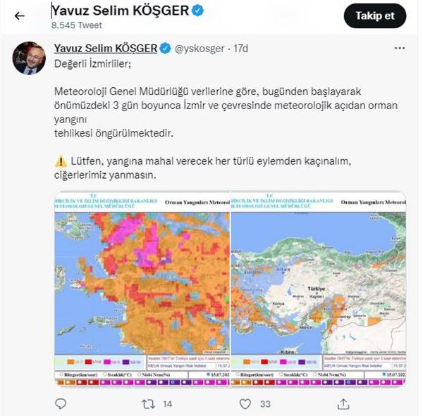 İzmir Valisi Yavuz Selim Köşger de olası yangınlara karşı uyararak "Değerli İzmirliler; Meteoroloji Genel Müdürlüğü verilerine göre, bugünden başlayarak önümüzdeki 3 gün boyunca İzmir ve çevresinde meteorolojik açıdan orman yangını tehlikesi öngürülmektedir. Lütfen, yangına mahal verecek her türlü eylemden kaçınalım, ciğerlerimiz yanmasın" dedi. (DHA)