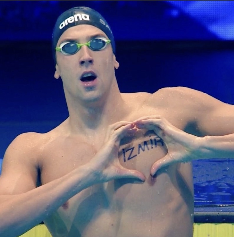 Fenerbahçe adına yüzmesine rağmen ailesi, kendisi ve antrenörleri İzmir'de yaşayan sporcu, 30 Ekim'de İzmir'de 114 vatandaşımızın ölümüne neden olan deprem haberini rekor kırdığı yarıştan 4 gün sonra Budapeşte'de aldı. Yarışma devam ettiği için aklı ve kalbi İzmir'de kalmasına rağmen havuza giren sporcu, dün yine 50 metre kurbağalamada 25.29'luk derecesiyle birinci olup 10 gün sonra kendi rekorunu kırarken, büyük acı yaşayan memleketini unutmadı. Havuza göğsünde kalbinin üzerine gelen yere "İzmir" yazan sporcu, yarıştan sonra kalp hareketi yapıp kentin acısını paylaştı. Emre, yarışın ardından sosyal medyada bu fotoğrafı yayınlayarak, bugüne kadar çektirdiği en anlamlı kare olduğunu belirtti.
