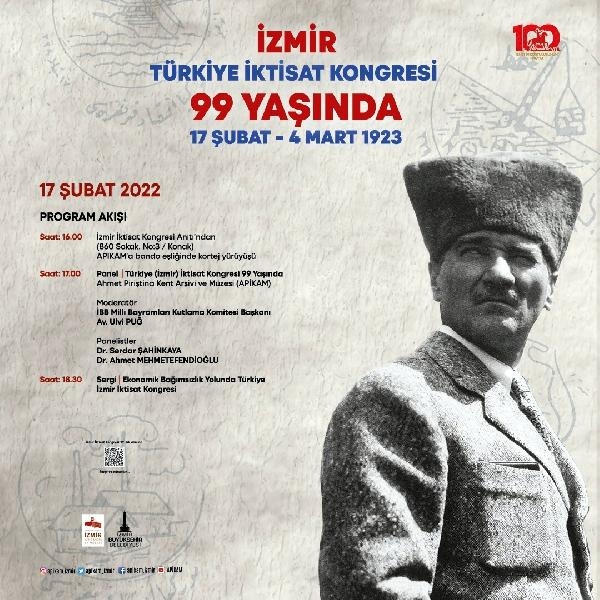 İzmir Büyükşehir Belediyesi Ahmet Piriştina Kent Arşivi ve Müzesi (APİKAM), Gazi Mustafa Kemal Atatürk önderliğinde genç Cumhuriyetin iktisadi rotasını belirlemek üzere 17 Şubat-4 Mart 1923 tarihleri arasında düzenlenmiş İzmir İktisat Kongresi'nin 99. yıl dönümünü bir dizi özel etkinlikle anacak. Etkinlikler yarın saat 16.00'da Konak'ta 560 Sokak'taki İzmir İktisat Kongresi Anıtı'ndan APİKAM binasına bando eşliğinde yapılacak kortej yürüyüşü ile başlayacak, panel ve sergi açılışı ile devam edecek. 'Türkiye (İzmir) İktisat Kongresi 99 Yaşında' başlıklı panel 17.00'de APİKAM Toplantı Salonu'nda düzenlenecek. İzmir Büyükşehir Belediyesi Milli Bayramları Kutlama Komitesi Başkanı Ulvi Puğ'un moderatörlüğünü üstleneceği panele Dr. Serdar Şahinkaya ve Dr. Ahmet Mehmetefendioğlu konuşmacı olarak katılacak.