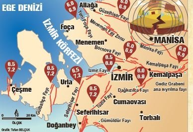 İzmir bölgesinde de deprem riski olduğuna dikkat çeken Naci Görür şöyle konuştu: "İzmir Körfez de büyük bir fay var. İzmir fayı ciddi bir fay ve 7 ve üzerinde bir deprem üretebilir. Nitekim, Körfez alanı 70 kilometre olmasına rağmen 117 kişi hayatını kaybetti. O bölge zayıf zemin. İzmir bölgesinde yaklaşık 12-13 tane aktif fay var."