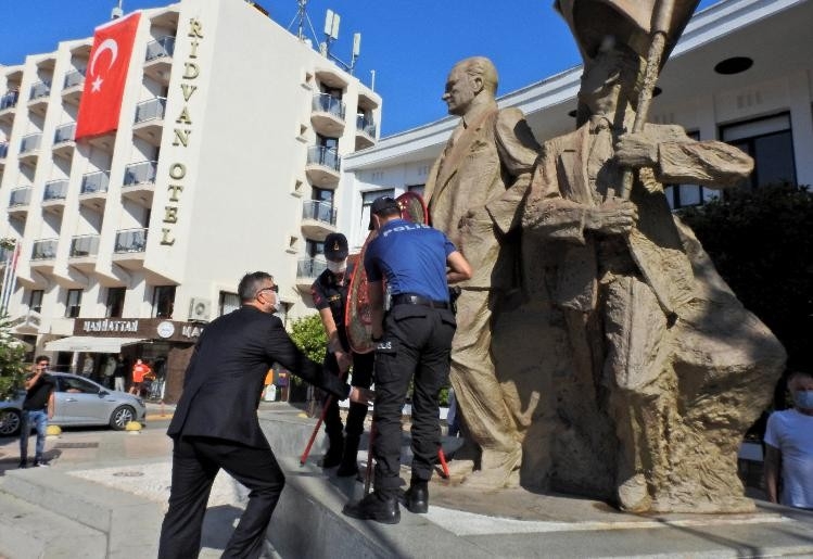 Bayraklı Belediye Başkanı Serdar Sandal, İlçe Kaymakamı İbrahim Süha Karaboran ve Ege Deniz Bölge Komutanı Tuğamiral Cemalettin Bozdağ ile birlikte Sevgiyolu girişindeki Atatürk Anıtı'na çelenk sundu. Başkan Sandal, "Türk milletinin bağımsızlığa giden yoldaki nihai zaferi olan 30 Ağustos Zafer Bayramımızın 98'inci yılı tüm ulusumuza kutlu olsun. Başkomutan Gazi Mustafa Kemal Atatürk ve kahraman şehitlerimizi rahmet, minnet ve şükranla anıyorum" dedi.