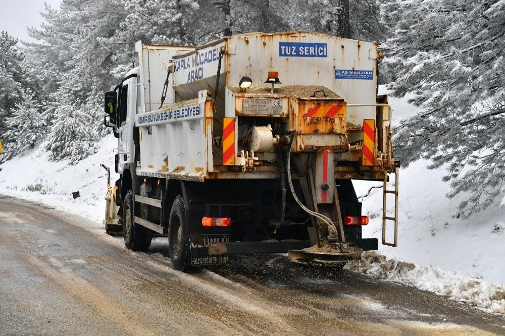 İzmir Büyükşehir Belediyesi merkez, kuzey ve güney olmak üzere üç bölgede kar küreme ve tuz serim araçlarıyla çalışıyor. Kar yağışının artması ihtimaline karşı da greyder, kamyon ve iş makineleri teyakkuzda bekletiliyor. Büyükşehir ekipleri, Bergama'nın Yuntdağı Köseler, Tavukçukuru, Balaban, Atçılar, İsmailli, Bayramcılar, Hacılar, Öksüzler, Seklik köylerinde, Karabağlar Tırazlı köyünde, Menemen'de Çukurköy, Turgutlar, Bozalan, Telekler mahallerinde, Karaburun Yaylaköy'de, Kemalpaşa'da Beşpınar, Bayramlı, Çınardibi mahallerinde, Kınık'ta Çanköy, Karadere, Elmadere, Bağalan, Büyükoba, Arpadere, Hacıömerli, Arpaseki, Aziziye, Taştepe, Değirmencili, Kalemköy, Yaylaköy köylerinde tuzlama ve yol açma çalışmalarını tamamladı. Kemalpaşa Spil yolunda, Bornova Beşyol Mahallesinde, Kiraz'da Uzunköy Mahallesinde, Bergama Topallar, Oruçlar, Yukarıada, İkizler köylerinde de tuzlama çalışmaları sürüyor.