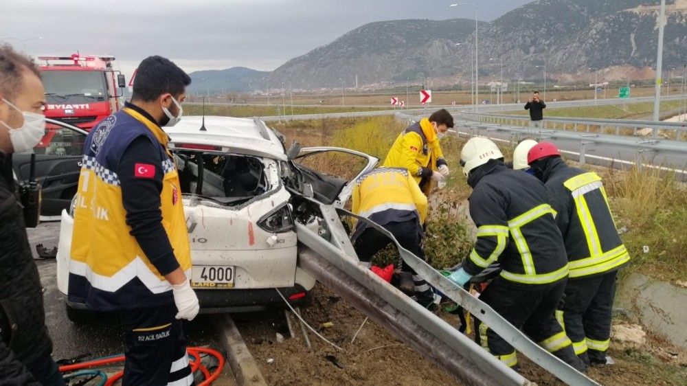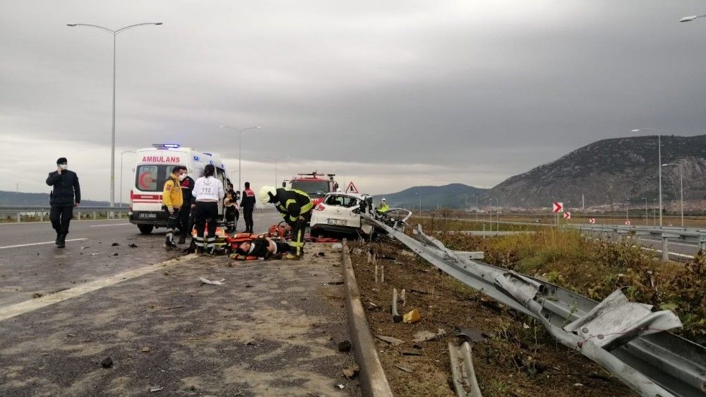 İzmir-İstanbul Otoyolu'nda sürücüsünün direksiyon hakimiyetini kaybettiği otomobil bariyerlere ok gibi saplandı. Kazada otomobildeki 3 kişi ağır yaralandı.