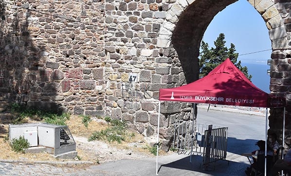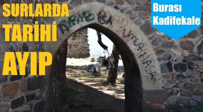 İzmir'in farklı dönemlerine ait kalıntılar taşıyan, kentin simgelerinden Kadifekale'nin surlarına kimliği belirsiz kişi ya da kişilerce sprey boyalarla yazılan yazılar tepki çekiyor