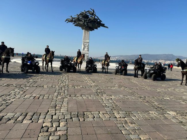 Özellikle; Gündoğdu Meydanı, Alsancak İskele, Cumhuriyet Meydanı ve Güzelyalı bölgesindeki sahil boyunca 6 atlı polis birlikleri ve 10 ATV’li polis timleri, özel tedbirler çerçevesinde bölgede görev alıyor.