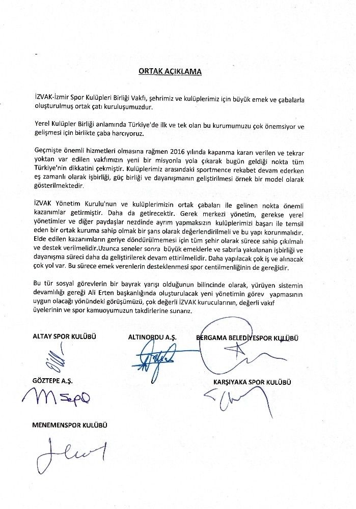 "İZVAK, şehrimiz ve kulüplerimiz için büyük emek ve çabalarla oluşturulmuş ortak çatı kuruluşumuzdur. Yerel 'Kulüpler Birliği' anlamında Türkiye'de ilk ve tek olan bu kurumumuzu çok önemsiyor ve gelişmesi için birlikte çaba harcıyoruz. 2016 yılında kapanma kararı verilen ve daha sonra tekrar kurulan vakfımızın, yeni bir misyonla yola çıkarak geldiği nokta, tüm Türkiye'nin dikkatini çekmiştir" vurgusunun yapıldığı imzalı bildiride, "Kulüplerimiz arasındaki sportmence rekabet devam ederken eş zamanlı olarak iş birliği, güç birliği ve dayanışmanın geliştirilmesi örnek bir model olarak gösterilmektedir" denildi. Başkanlar, kulüplerin ve İZVAK'ın çabaları ile gelinen noktanın önemli kazanımları beraberinde getirdiğine de dikkat çekti.