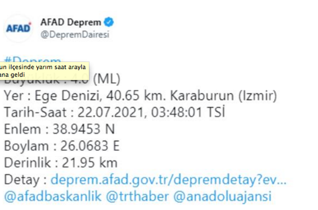 Kısa bir süre önce yıkıcı bir depremle sarsılan İzmir'de yaralar sarılsa da sık sık yaşanan depremler sebebiyle endişe sürüyor. Son olarak İzmir'in Karaburun ilçesi açıklarında 32 dakika arayla art arda iki deprem meydana geldi. AFAD'ın açıkladığı verilere göre ilk depremin büyüklüğü 4.0; ikincisinin ise 4.2 büyüklüğünde olduğu belirlendi.