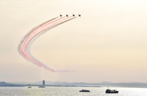 Saat 15.45'de Süvari Birlikleri'nin Cumhuriyet Meydanı'ndan Gündoğdu Meydanı'na yapacağı yürüyüşten hemen sonra İzmir semaları, saat 16.15'den itibaren önce Genel Havacılık Uçakları ve İzmir Kulüpleri selamlama uçuşuna sahne olacak. Gökyüzü Hürkuş Gösteri Uçuşu, Solo Türk, Türk Yıldızları, Jandarma Çelik Kanatlar gösterisi, Polis Havacılık Üzüm Salkımı, Sahil Güvenlik Arama Kurtarma ve selamlama ile Flyboard gösterisi ile şenlenecek. Ayrıca saat 19.00'da Deniz-Hava-Karada Zeybek- Türk Silahlı Kuvvetleri Armoni Mızıkası 100'üncü yıl coşkusunu zirveye taşıyacak.