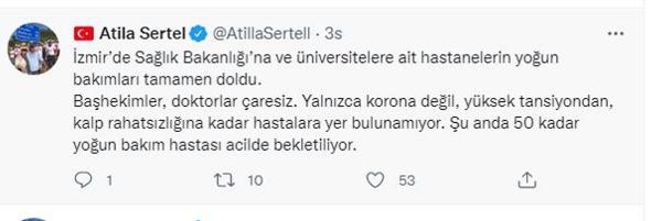 CHP İzmir Milletvekili Atila Sertel, sosyal medya hesabından, İzmir'de Sağlık Bakanlığı'na ve üniversitelere ait hastanelerin yoğun bakımlarının tamamen dolduğu paylaşımında bulundu. Milletvekili Sertel, paylaşımında ayrıca, "Başhekimler, doktorlar çaresiz. Yalnızca korona değil, yüksek tansiyondan, kalp rahatsızlığına kadar hastalara yer bulunamıyor. Şu anda 50 kadar yoğun bakım hastası acilde bekletiliyor" ifadelerine yer verdi.