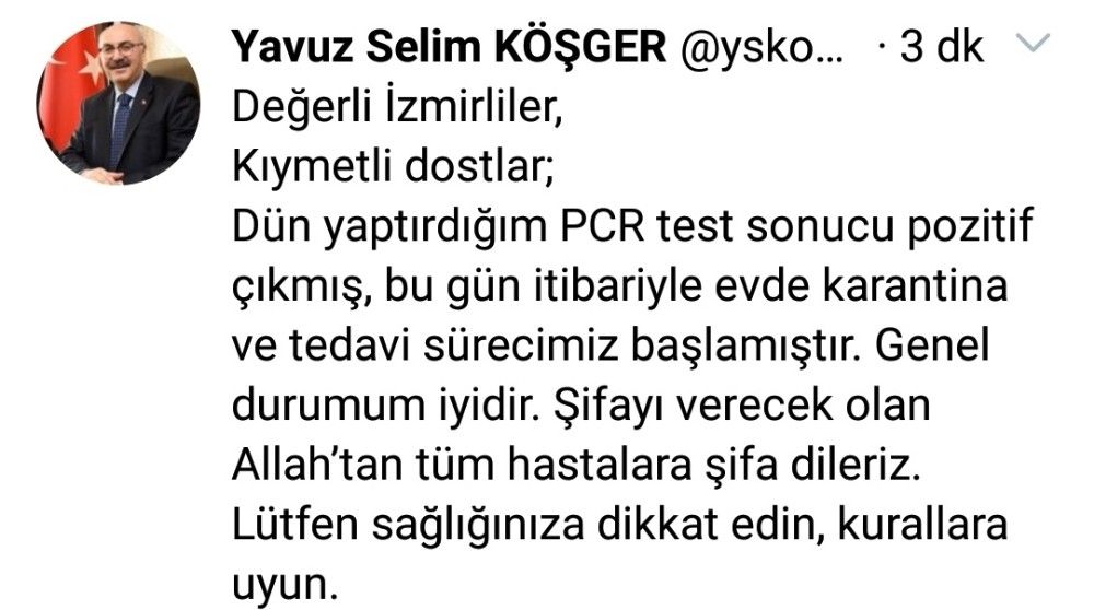 "Değerli İzmirliler, kıymetli dostlar; Dün yaptırdığım PCR test sonucu pozitif çıkmış, bu gün itibariyle evde karantina ve tedavi sürecimiz başlamıştır. Şifayı verecek olan Allah'tan tüm hastalara şifa dileriz. Lütfen sağlığınıza dikkat edin, kurallara uyun."