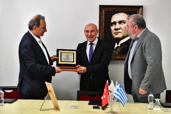 Vyronas Belediye Başkanı Grigoris Katopodis ve Kesariani Belediye Başkanı Christos Voscopoulos ise imzalanan 'Dostluk ve İş Birliği Beyanı' için Başkan Tunç Soyer'e teşekkür edip, hediye verdi.