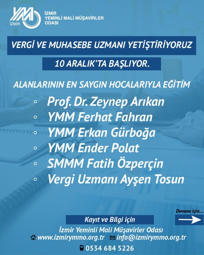 İlk program 10 Aralık’ta başlıyor İzmir Yeminli Mali Müşavirler Odası (İzmir YMMO), sektörde artan nitelikli uzman ihtiyacına yanıt vermek amacıyla hayata geçirdiği Vergi Eğitim Merkezi için çalışmalara başladı.