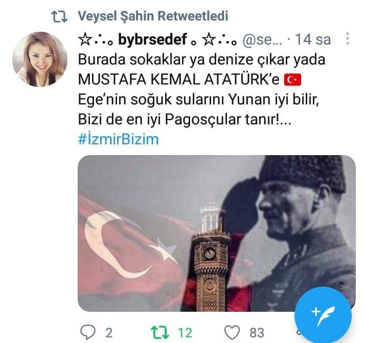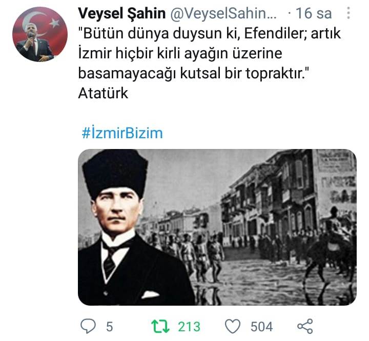 Gündem çalışmasında en çok vurgu yapılan Tvitlerin başında yine il başkanı Şahin’in Atatürk’ün “Bütün dünya duysun ki Efendiler; artık İzmir kirli ayağın üzerine basamayacağı kutsal bir topraktır” içerikli paylaşımı oldu. Yüzlerce kişi tarafından paylaşılan tivitin görselinde de kalpaklı Atatürk resmi yer aldı. MHP’in 30 ilçe teşkilatınında kendi ilçelerinin ön plana çıkan değerleriyle paylaşımlar yaptığı “#İzmirBizim” çalışması İzmirliler tarafından da beğeni ve retveetlerle desteklendi.