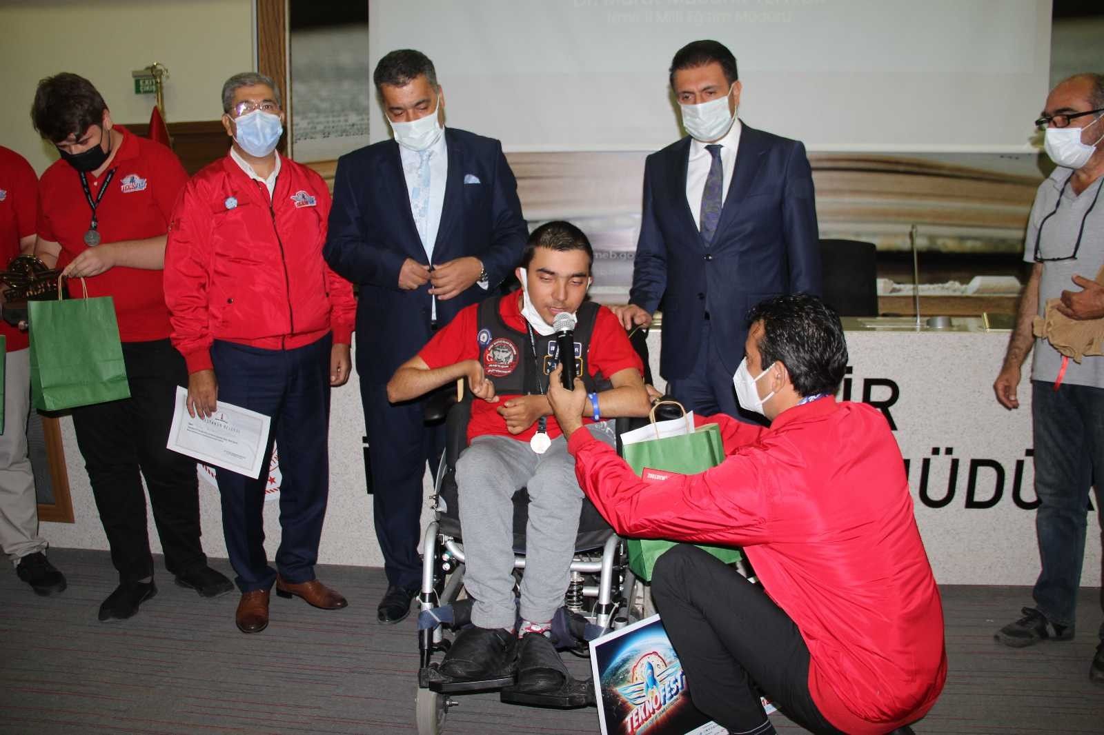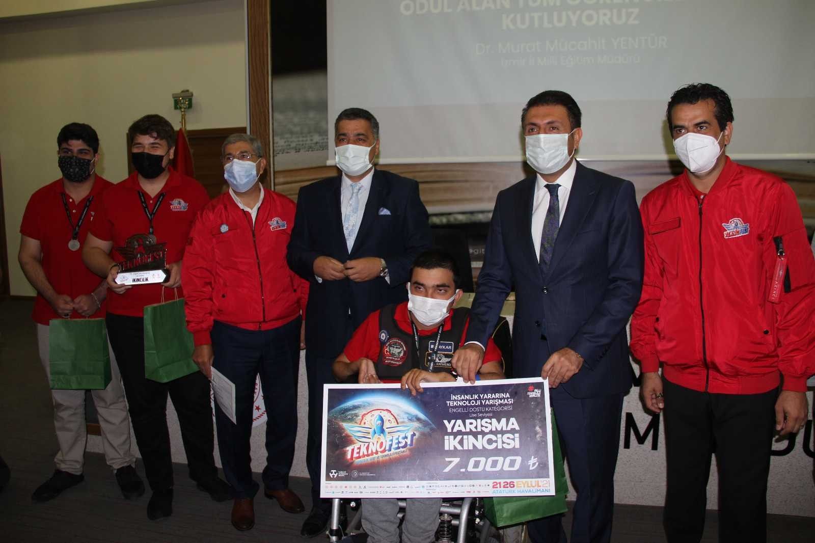 Türkiye'nin en önemli bilim ve teknoloji festivali olan TEKNOFEST 2021'de adeta İzmir rüzgarı esti. Fatma Saygın Anadolu Lisesi öğrencisi Murat Işık, 'Biyoteknoloji Yarışması'nda Türkiye 1.'si; Arkas Bilim ve Sanat Merkezi öğrencileri Bade Bereketoğlu, Ayşe Özdemir ve Barkın Özsoy, 'İnsanlık Yararına Teknoloji Yarışması Afet Yönetimi Kategorisi'nde Türkiye 1.'si; Özel Dünya Fen Lisesi öğrencisi Mert Delibalta, "Eğitim Teknolojileri Yarışması"nda Türkiye 1.'si; Bornova Anadolu Lisesi öğrencisi Can Baki, 'Lise Fikir Yarışması'nda Türkiye 2.'si; Seferihisar Semiha - İrfan Çalı Mesleki ve Teknik Anadolu Lisesi öğrencileri Ege Katmerci, Yiğit Aliyev ve Efe Bilir, 'İnsan Yararına Engelli Dostu Katogerisi'nde Türkiye 2.'si; Özel Gaziemir Uğur Ortaokulu öğrencisi Barkın Özsoy, 'Akıllı Ulaşım Yarışması'nda Türkiye 3.sü ve Arkas Bilim ve Sanat Merkezi öğrencisi Artun Özsoy, 'Lise Öğrencileri Kutup Araştırma Projeleri Kategorisi'nde Türkiye 3.'sü oldu. Bornova İzmir Fen Lisesi öğrencileri Alperen Tupurtu ve Ahmet Taha Kalıbcı da, 'Sağlıkta Yapay Zeka Yarışması'nda 'En İyi Sunum Ödülü'nün sahibi oldu. Ödül törenine, öğrenciler ve aileleri ile birlikte, ilçe müdürleri ve danışman öğretmenler Sertaç Ateş, Selçuk Sağbaş, Mustafa Arbay, Benginur Tenkılıç, Bora Cemal Özdemir, Zeynep Deniz Koçal, Ferit Avcı ve Hüseyin Taşatan da katıldı.