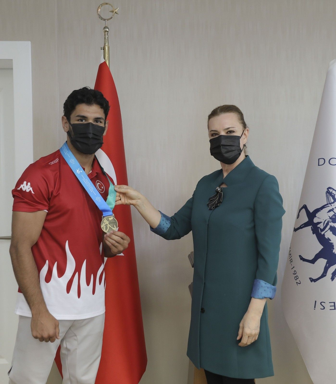 Dokuz Eylül Üniversitesi (DEÜ) Spor Bilimleri Fakültesi Beden Eğitim Öğretmenliği 4. Sınıf öğrencisi Yunus Emre Batan, bu başarı üzerine DEÜ Rektörü Prof. Dr. Nükhet Hotar'ı ziyaret etti.