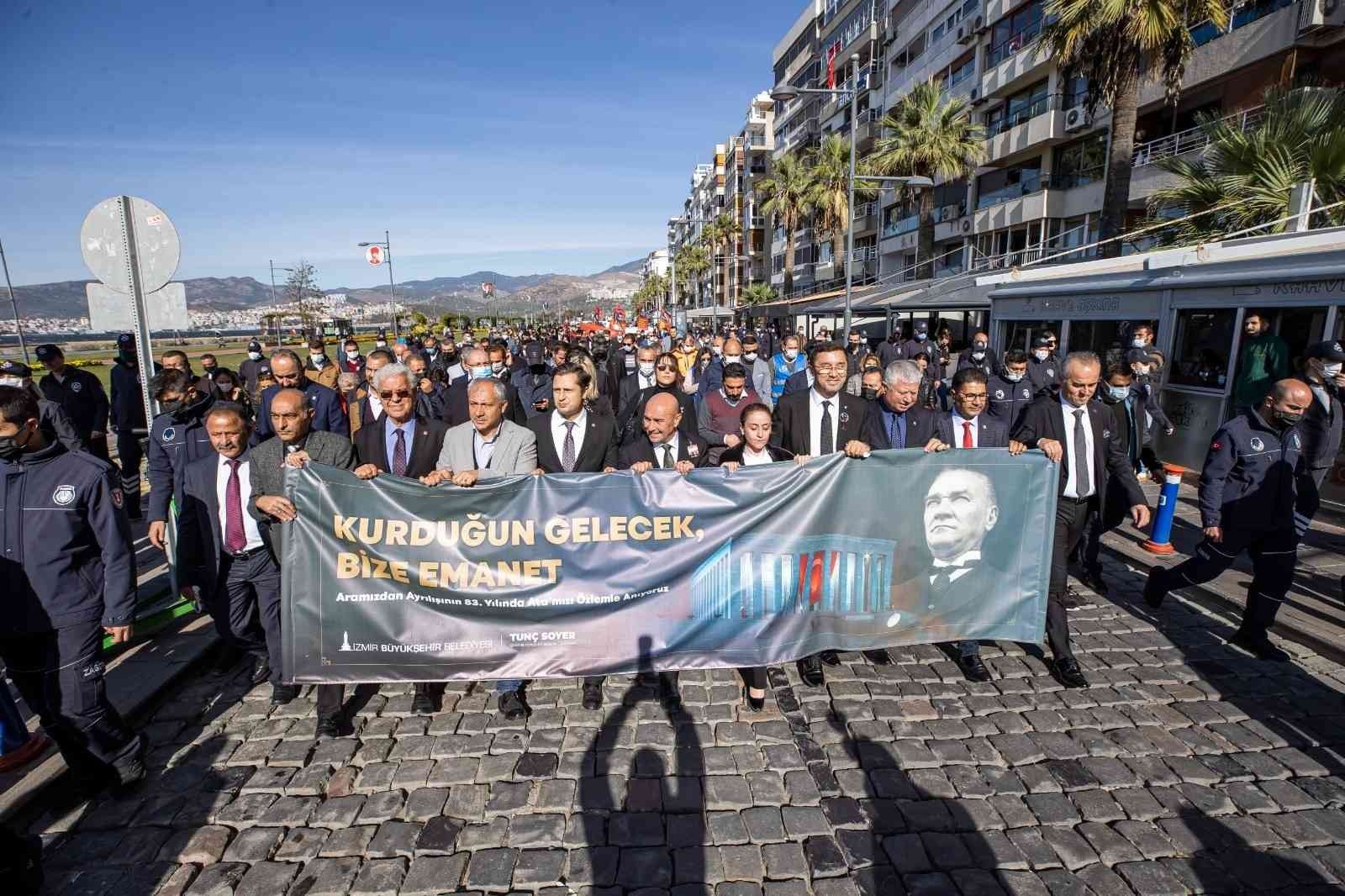 İzmir Büyükşehir Belediyesi'nin ulu önder Mustafa Kemal Atatürk'ün aramızdan ayrılışının 83. yıl dönümü için düzenlediği Ata'ya Saygı Yürüyüşü, binlerce İzmirliyi bir araya getirdi. İzmir Büyükşehir Belediye Başkanı Tunç Soyer, İzmir Büyükşehir Belediyesi Başkan Vekili Mustafa Özuslu, CHP İzmir İl Başkanı Deniz Yücel, CHP İzmir Milletvekili Ednan Arslan ile ilçe belediye başkanlarının da katıldığı Ata'ya Saygı Yürüyüşü, Alsancak Limanı önünden başladı. İzmirliler Atatürk'ün 350 metre uzunluğundaki dev posterini taşıyarak Cumhuriyet Meydanına kadar yürüdü. Katılımcılar, üzerinde "Kurduğun gelecek bize emanet" yazılı pankart taşıdı.