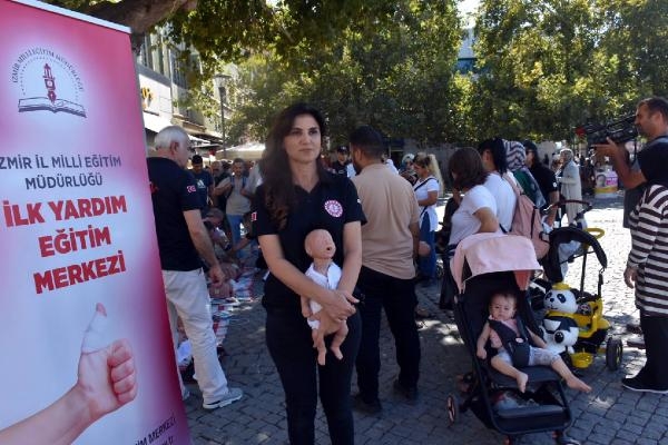 İzmir İl Milli Eğitim Müdürlüğü yetkilileri, her yıl eylül ayının ikinci cumartesi kutlanan 'Dünya İlk Yardım Günü' kapsamındaki çalışmalarını sürdürüyor. Bu kapsamında Valilik binası yanındaki alanda etkinlik düzenlendi. Kentin en işlek ve kalabalık alanlarından biri olan Tarihi Kemeraltı Çarşısı'nda kurulan stantta vatandaşlara ilk yardımın önemi anlatılırken, broşürler dağıtıldı. Uzman kişiler, öğrenci ve yetişkinlere ilkyardım müdahalelerini uygulamalı gösterdi. Evli ve 3 çocuk annesi ev kadını Asuman Şimşek (41) çocuğunun boğazına bir şey kaçması durumunda nasıl müdahale etmesi gerektiğini öğrendiğini belirterek, "Doğru bildiğimiz yanlışlar varmış. Arkadaşlarımız burada bize neler yapmamız gerektiğini öğrettiler. Çok faydalı olduğunu düşünüyorum" dedi.