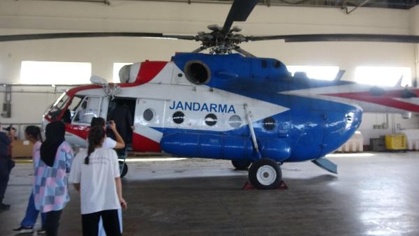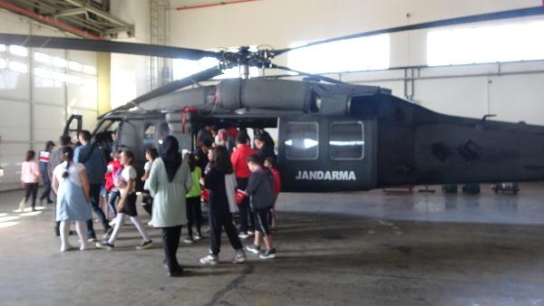 Öğrenciler, daha sonra otobüslerle Jandarma Filo Komutanlığı'na geçti. Burada helikopterlere binip, inceleme fırsatı bulan öğrenciler, yaşadıkları heyecanı anlattı. Kokpitte de oturan öğrencilere pilotlar, helikopterle ilgili bilgi verdi.