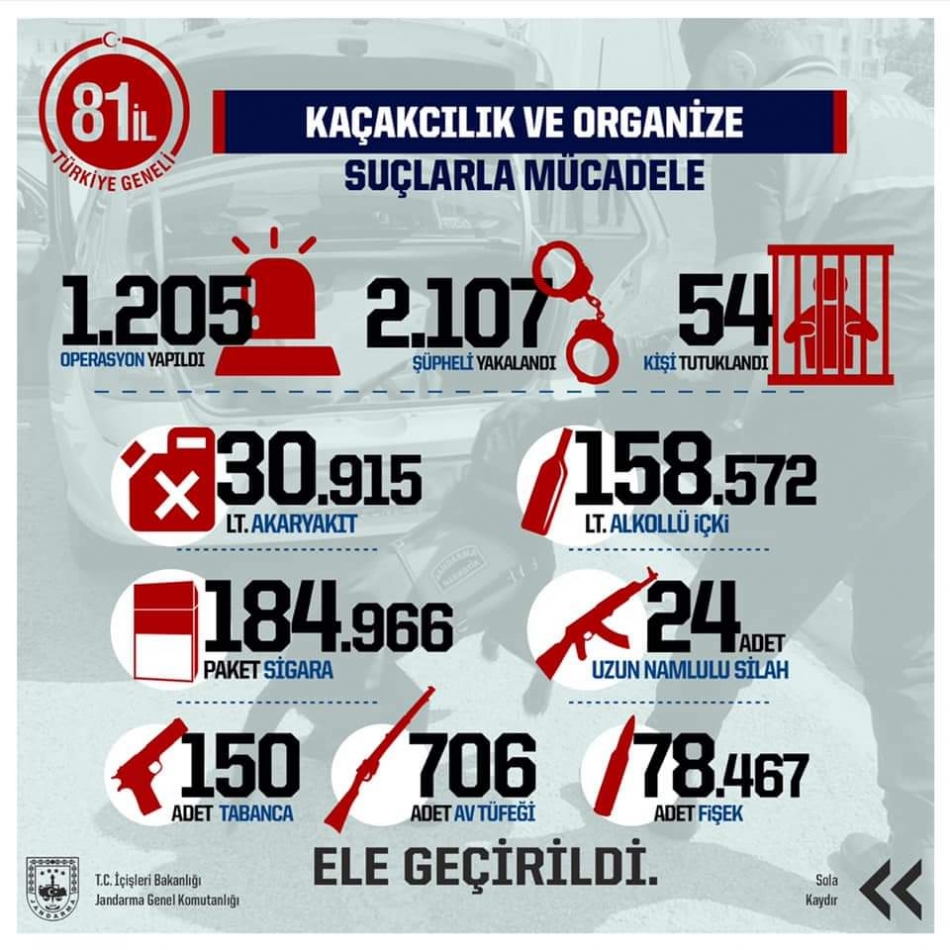 Jandarma ekipleri tarafından Kaçakçılık ve Organize Suçlarla Mücadele kapsamda ise yapılan uygulamalarda, bin 205 operasyon düzenlediği, 2 bin 107 şüphelilin yakalandığını, 54'ünün tutuklandığını, 30 bin 915 litre kaçak akaryakıt, 158 bin 572 litre alkollü içki, 184 bin 956 adet kaçak sigara, 24 adet uzun namlulu silah, 150 adet tabanca, 706 adet av tüfeği ve bunlara ait 78 bin 467 adet fişeği ele geçirildiği ortaya çıktı.