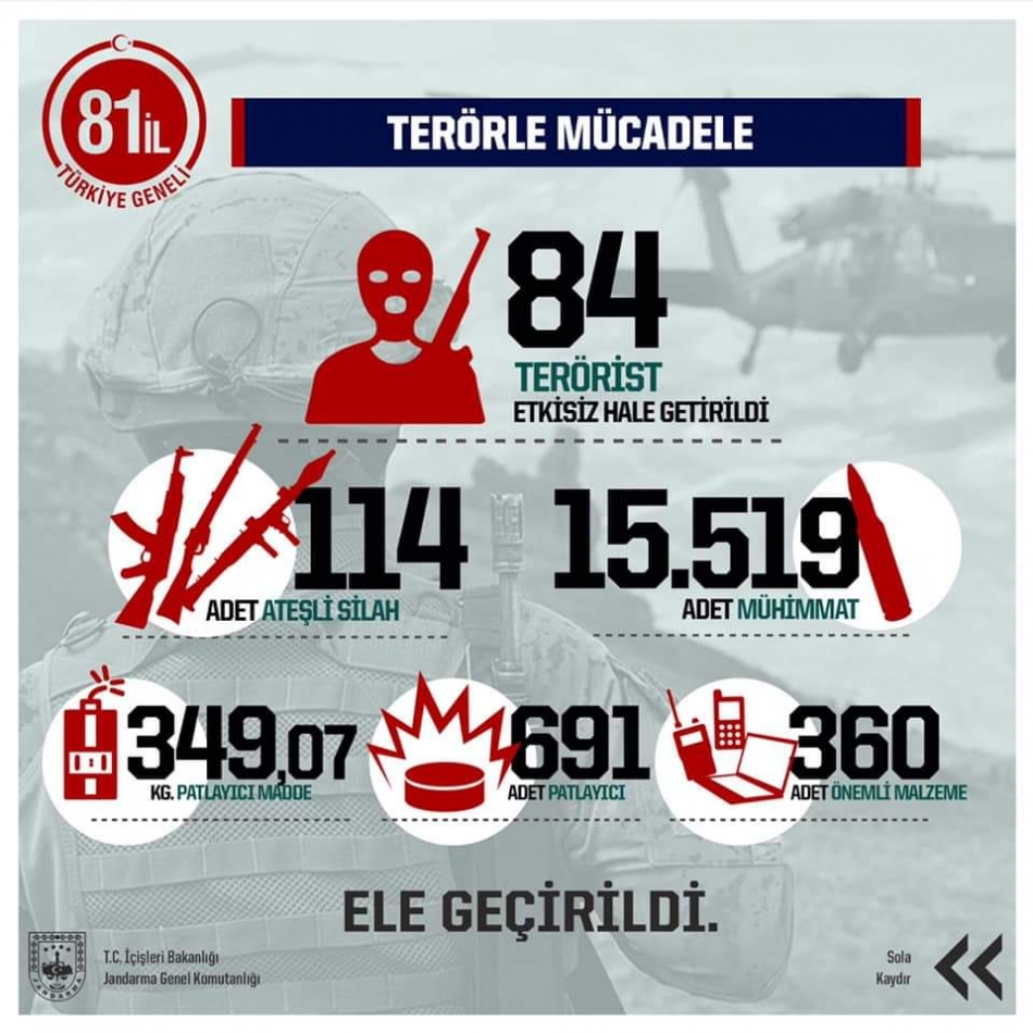 Terörle Mücadele kapsamında jandarma unsurları, 84 teröristin etkisiz hale getirildiğini, 114 adet silah, 15 bin 519 adet mühimat, 349.07 kilogram patlayıcı madde, 691 adet patlayıcı ve 361 adet önemli mühimatın ele geçirildiğini belirtti.