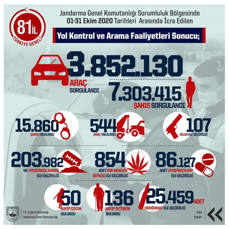 Jandarma Genel Komutanlığınca, 1-31 Ekim 2020 tarihleri arasında, ülke genelinde gerçekleştirilen operasyonlar ve asayiş uygulamalarını sayfasında yayınladı.