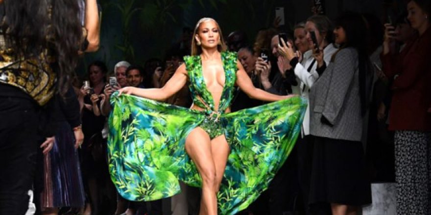 Jennifer Lopez katıldığı Versace defilesinde, 2000 yılında katıldığı Grammy töreninde giydiği ve tarihe geçen ikonik yeşil elbisenin bir benzerini tanıttı.