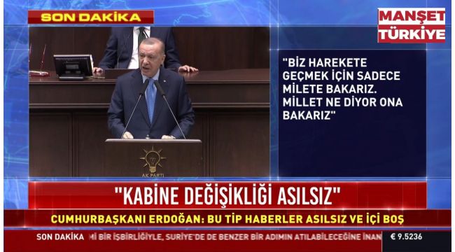 Tabi bununla birlikte kabine değişikliği gibi spekülasyonların da döndüğü bir süreç başlatılmak istendi. Bizim medya tabi bu konuda mahir. Ancak Tayyip Erdoğan kalemşörlerin lafıyla hareket etmez. Siz yazacaksınız, ya ad televizyonlarda konuşacaksınız biz de ona göre mi heraket edeceğiz? Biz buralara makalelerle gelmedik. Tam aksine kalemşörlerle savaşa savaşa bu makama geldik. Milletimizle geldik.