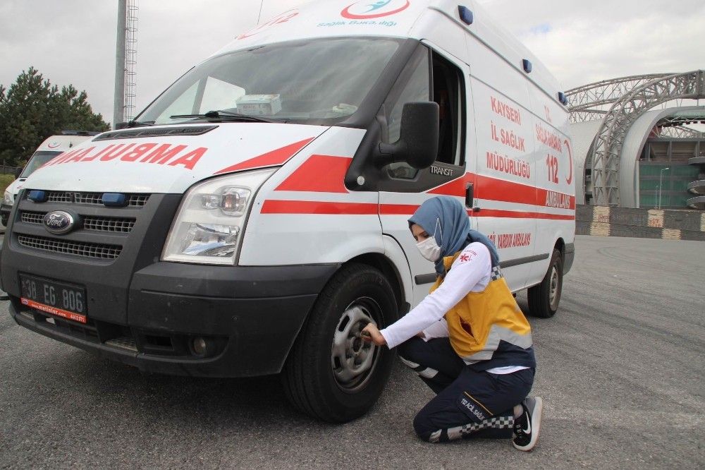Kayseri'de kadın ambulans şoför adaylarına verilen eğitimler sürüyor. Kadın acil tıp teknisyenlerine ve parademiklere sürüş, lastik değişimi, akü takviyesi ve zincir takma eğitimleri veriliyor.