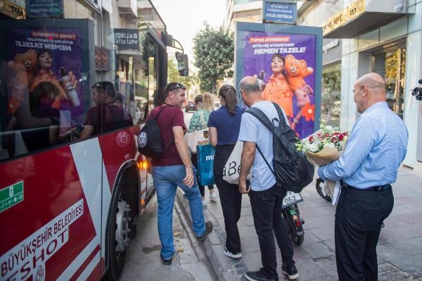 İZMİR Büyükşehir Belediye Başkanı Tunç Soyer, durak harici yolcu almadığı için darbedilen şoför Burçin Akça'ya, kullandığı otobüse binerek çiçek verdi. Soyer'e teşekkür eden Akça, "Hayatta her şey başımıza gelebiliyor. Ama bizim tüm bunlara inat işimize, mesleğimize sarılmamız lazım" dedi.