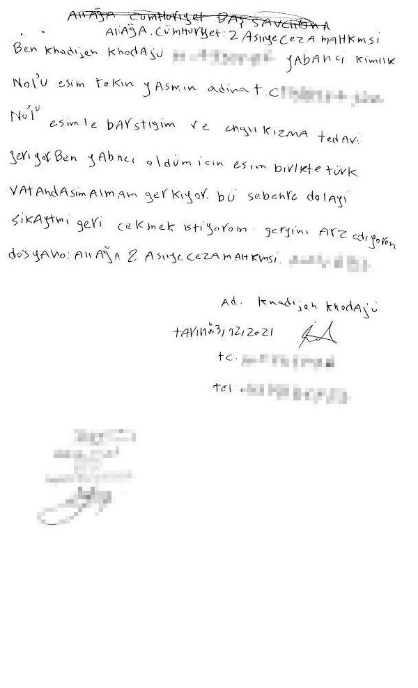 Dosya ağır ceza mahkemesinde kabul edildikten sonra Khodajou'nun, sanık eşi Yaşmin hakkındaki şikayetini geri çektiği ortaya çıktı. Yaşmin'in cezaevinden Khodajou'ya barışmak ve şikayetini geri çekmesi için mektuplar yazdığı, Khodajou'nun da bunun üzerine avukatlarına dahi haber vermeden şikayetlerini geri çektiği belirtildi. Khodajou'nun şikayetini geri çektiği dilekçesinde, "Eşimle barıştım ve kızıma tedavi gerekiyor. Yabancı olduğum için eşimle birlikte Türk vatandaşı olmam gerekiyor. Bu sebeplerden dolayı şikayetimi geri çekmek istiyorum" sözleri yer aldı.