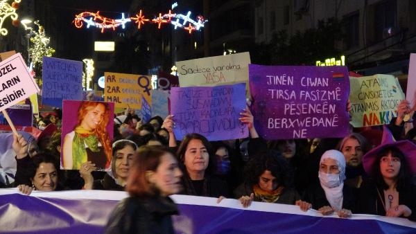 İzmir'de Kadınlar Günü'de yürüyüş yapmak isteyen kadınlarla onlara engel olmak isteyen polis arasında arbede yaşandı.
