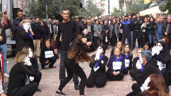 Kadına yönelik şiddete dikkat çekmek amacıyla temsili olarak sahnelenen etkinliğe, İncirliova ilçesinde eski eşi İsmail Demirci'nin (35) baltalı saldırısında 5 parmağı kopan İlke Kuleli (29) de katıldı. Habibe Gürer, gösteri sonrası yaptığı konuşmada, "Daha özgür, daha eşit, şiddetsiz bir yaşam için yaşamak istiyoruz. Dünya yerinden oynar kadınlar özgür olsa" derken, İlke Kule ise "Kadınız hep birlikte el ele mücadele edersek daha güçlü oluruz. Bizi duyun" diye konuştu.