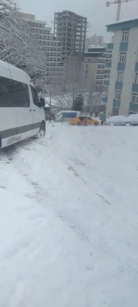 Kağıthane'de, geçtiğimiz günlerde etkili olan kar yağışıyla beraber buzlanan rampada kayan taksideki müşteri, araçtan atladı. Paniğe kapılan yolcunun araçtan atlaması ve taksinin kayma anı cep telefonu kameralarına yansıdı.