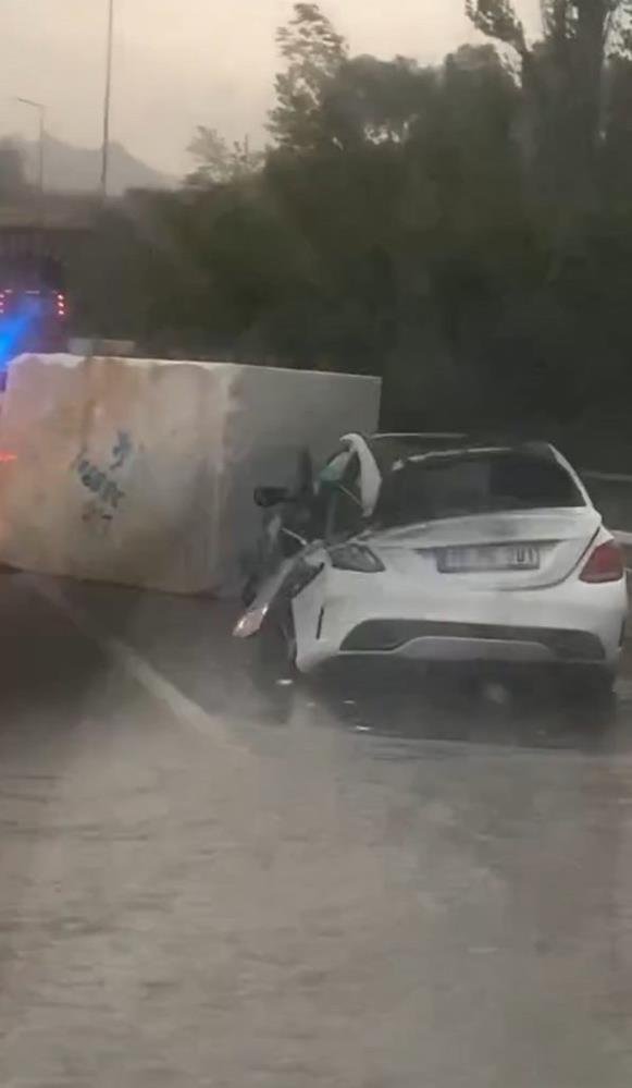 Aydın-Muğla Karayolu'nda kamyon kasasından düşen dev mermer blok, bir otomobili hurdaya çevirdi. Kan donduran kazanın can kaybı olmadan atlatılması yüreklere su serpti.