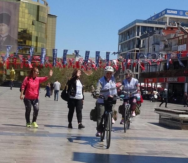 İki arkadaşın ilk durağı Aydın oldu. En güzel kıyafetlerini giyip süsledikleri bisikletlerle Süslü Kadınlar Turu'nu başlatan ve geçen günlerde Birleşmiş Milletler'in 2022 Dünya Bisiklet Günü Özel Ödülü'ne layık görülen kadınlarla buluşup bir süre sohbet eden Aktürk ve Elibol, kenti çok beğendiklerini söyleyerek tekrar bisikletleriyle yola çıktı.