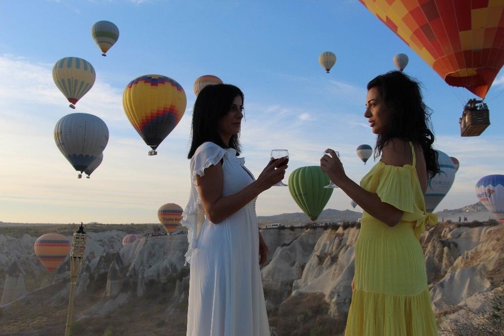 Gündoğumu ile birlikte havalanan sıcak hava balonlarının gökyüzündeki görsel şöleni ise yerli ve yabancı turistlerin büyük ilgisini çekiyor. Peribacaları eşliğinden gökyüzünde görsel şölenini izleyen yerli ve yabancı turistler ise bol bol fotoğraf çekerek bu anları ölümsüzleştiriyor.