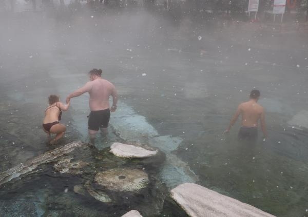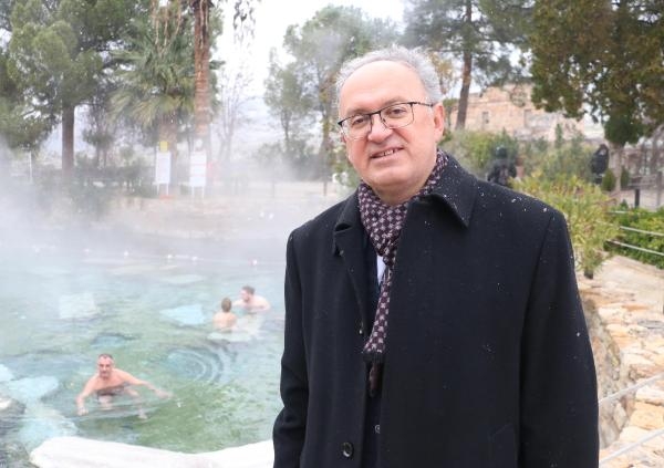 İl Kültür ve Turizm Müdürü Turan Veli Akyol, Pamukkale'nin her mevsim turist çektiğini belirterek, "Hava soğuk ve kar yağışı olmasına rağmen turistler antik havuza giriyor. Kar altında 36 derece sıcak havuzda yüzmenin keyfini yaşıyorlar. Pamukkale, dünyada eşi benzeri olmayan bir yer. Dünyada 19 yerden bir tanesi. Kar yağışında Pamukkale'nin beyaz traverteniyle iki beyaz birleşiyor. Muhteşem bir görüntü ortaya çıkıyor. Turistlerde böyle bir anı yaşamaktan gayet memnunlar" dedi.