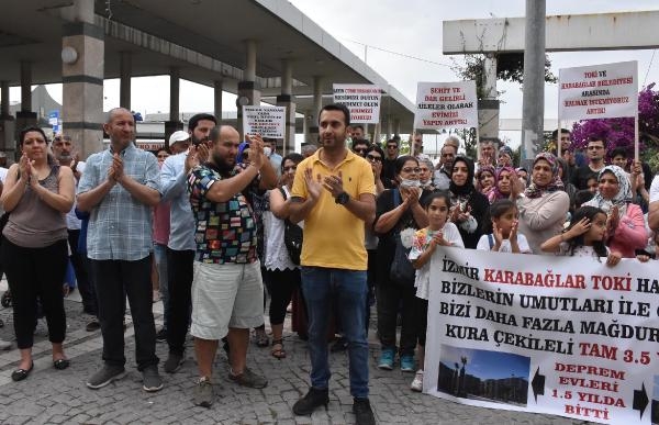 TOKİ 100 bin Sosyal Konut Projesi'nin ilk kurasında belirlenen talihlilerden olduklarını ifade eden Alişan İnal (33), kura çekildikten sonra büyük sevinç yaşadıklarını ancak geçen sürede mağdur edildiklerini ileri sürdü. İnal, "İmar planı iptal edildi. İnşaat başlama aşamasındayken durdu. İki yıl içinde evlerimize geçip oturabileceğimiz taahhüt edilmişti. Hepimiz kirada oturuyoruz. TOKİ dışında ev sahibi olma imkanımız yoktu. Mahkemeler nedeniyle inşaatı başlamadı. Tüm projeler bitme aşamasına gelirken biz de çivi bile çakılmadı. 750 hak sahibi aile var, herkes dar gelirli. Taraflar arasındaki anlaşmazlıklar nedeniyle biz mağdur oluyoruz. TOKİ yeni bir imar planını yayınlar yayınlamaz Karabağlar Belediyesi ilk iş olarak plana itiraz ediyor" dedi.