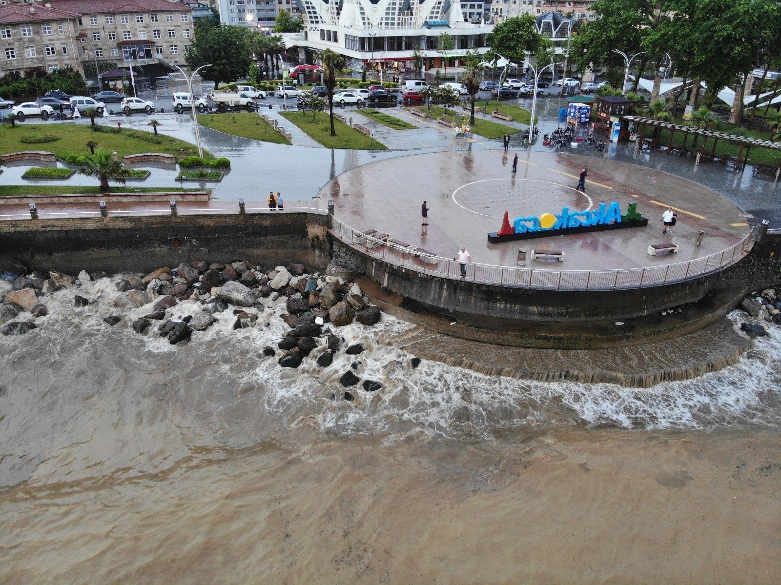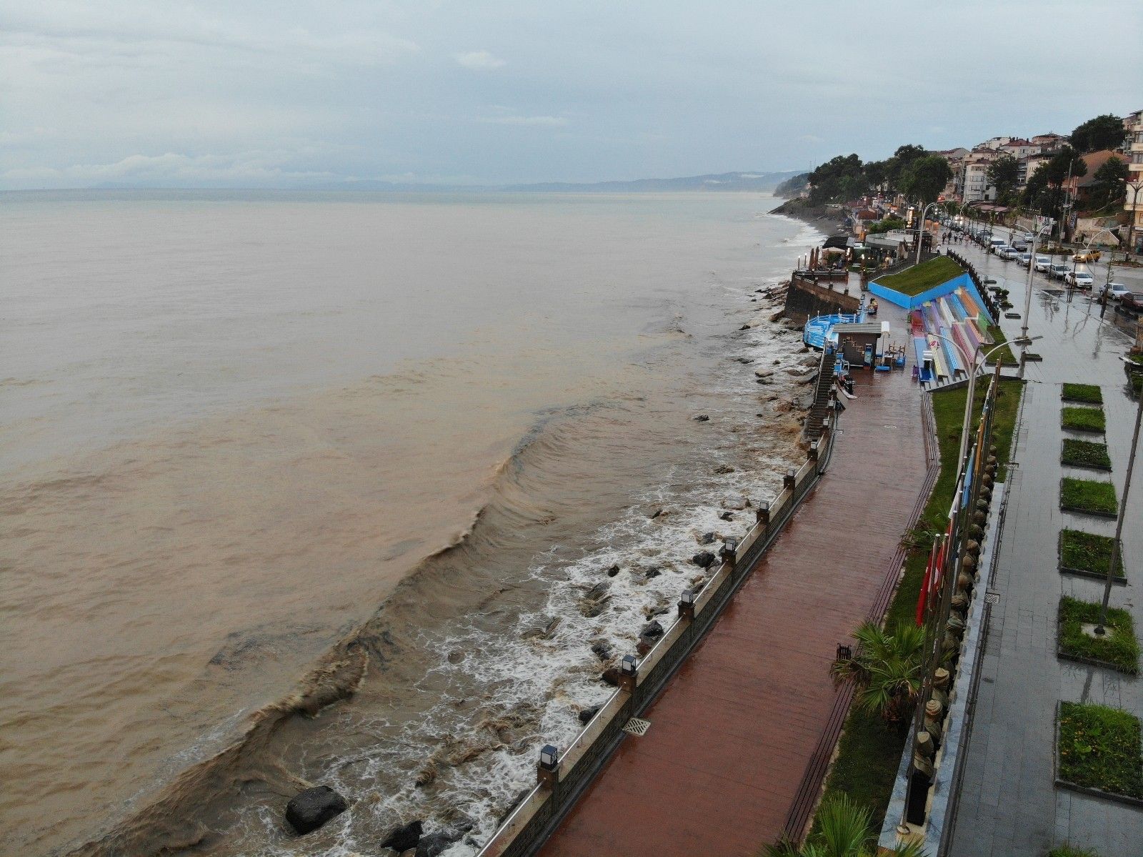 Düzce'de etkili olan yağmurun ardından dereden akan çamurlu su liman ve Çuhallı plajında denizin rengini değiştirdi.