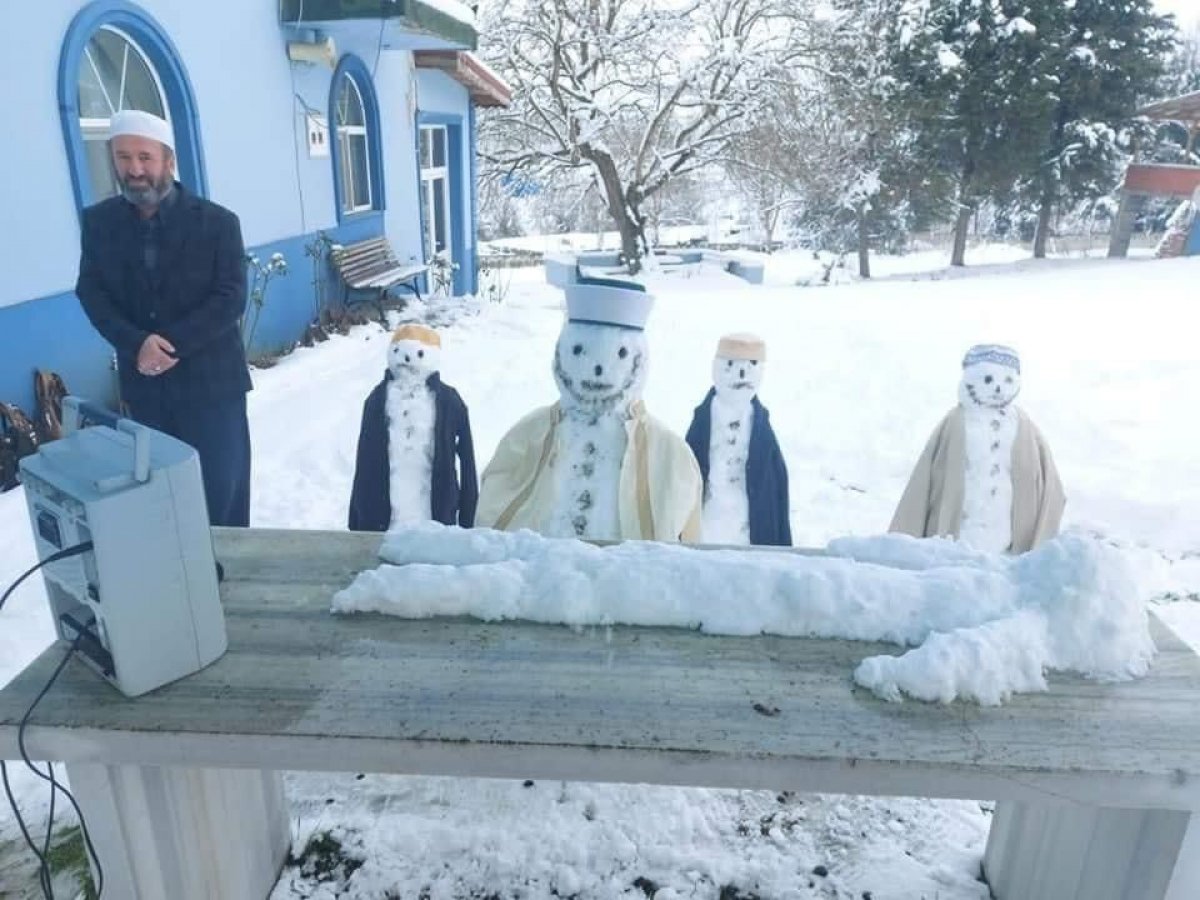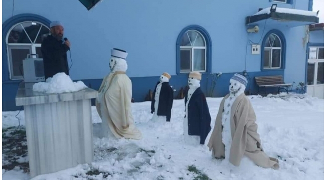 Cami bahçesinde kardan adamlarla cemaat yapılırken, cemaate cenaze namazı kıldırıldı. Kardan cemaati görenler, şaşkınlığını gizleyemedi.