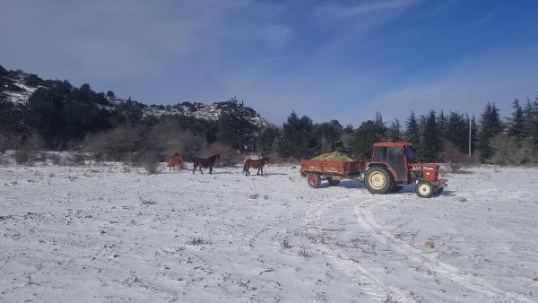 MANİSA'da 1517 metre rakıma sahip Spil Dağı Milli Parkı, yoğun kar yağışı nedeniyle beyaz örtüyle kaplandı. Eksi 10 derecede yem bulmakta güçlük çeken yılkı atları ile diğer yaban hayvanlar için yemleme çalışması yapıldı.