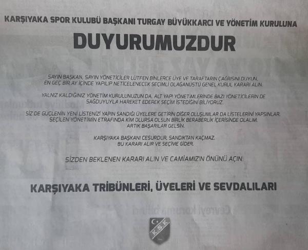 "Karşıyaka Spor Kulübü Başkanı Turgay Büyükkarcı ve yönetim kuruluna duyurumuzdur" diye başlayan ilanda, "Sayın başkan, sayın yöneticiler; lütfen binlerce üye ve taraftarın çağrısını duyun, en geç bir ay içinde yapılıp neticelenecek seçimli olağanüstü genel kurul kararı alın. Yalnız kaldığınız yönetim kurulunuzun da altyapı yönetimlerinde bazı yöneticilerin de sağduyuyla hareket ederek seçim istediğini biliyoruz. Siz de güçlenin, yeni listenizi yapın sandığı üyelere getirin, diğer oluşumlar da listelerini yapsınlar. Seçilen yönetimin etrafında kim olursa olsun birlik beraberlik içerisinde olalım. Artık başarılar gelsin. Karşıyaka başkanı cesurdur, sandıktan kaçmaz, bu kararı alır ve seçime gider. Sizden beklenen kararı alın ve camiamızın önünü açın" ifadeleri yer aldı.