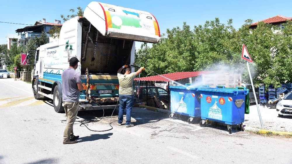 Kartepe Belediyesi Temizlik İşleri Müdürlüğü ekipleri mahallelerde bulunan çöp konteynerlerini, çöp toplama ekibi ile eşzamanlı olarak bulundukları yerde çöpleri boşaltıldıktan sonra yıkama aracı ile yıkanıyor.