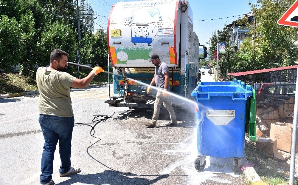 Kartepe Belediyesi ekipleri, korona virüs önlemleri kapsamında çöp konteynerini temizlemeyi ihmal etmiyor