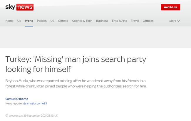 Garip yerel haberlere göre, sarhoş olup ormana giren bir Türk, daha sonra fark etmeden kendisini bulmak için çalışma yürüten bir arama ekibine katıldı.
