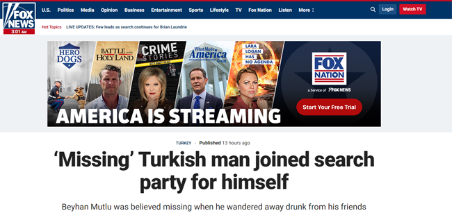 Fox News: Kayıp Türk, kendisi için arama ekibine katıldı